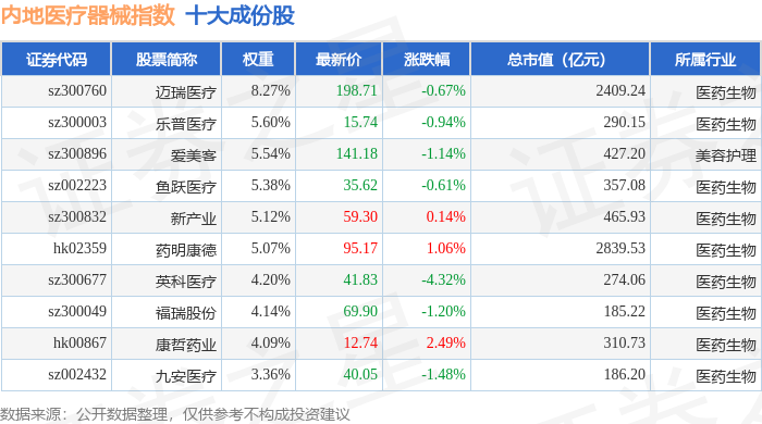 证券之星消息,12月9日,内地医疗器械(983103)指数报收于1776.47点,跌0.99%,成交65.25亿元,换手率0.88%。当日该指数成份股中,上涨的有10家,采纳股份以3.25%的涨幅领涨,下跌的有40家,微创医疗以4.78%的跌幅领跌。