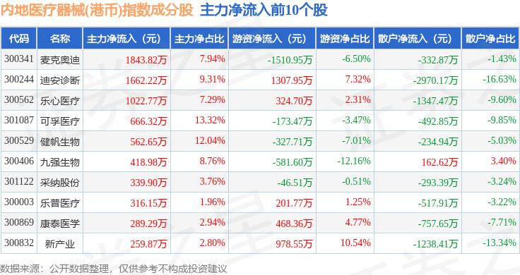 资金流向方面,内地医疗器械(港币)(983104)指数成份股当日主力资金净流出合计2.62亿元,游资资金净流入合计4811.67万元,散户资金净流入合计2.13亿元。成份股资金流向详情见下表: