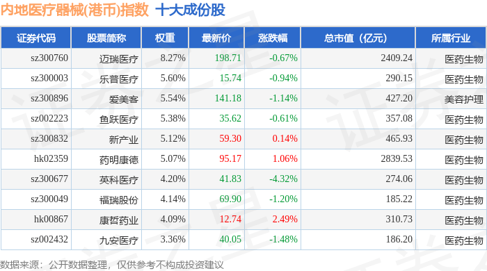 内地医疗器械(港币)(983104)指数十大成份股详情如下:
