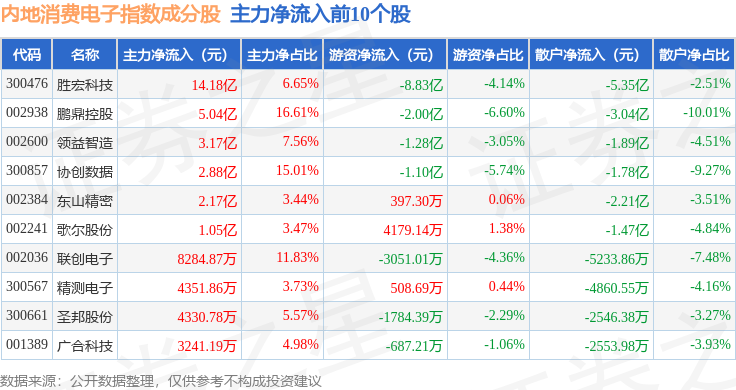资金流向方面,内地消费电子(983105)指数成份股当日主力资金净流入合计8.55亿元,游资资金净流出合计6.76亿元,散户资金净流出合计1.79亿元。成份股资金流向详情见下表: