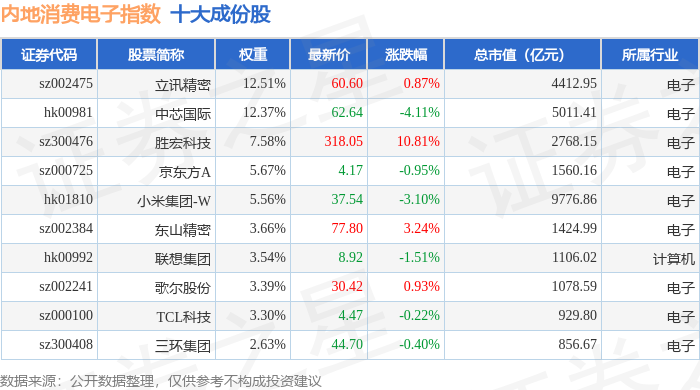 证券之星消息,12月9日,内地消费电子(983105)指数报收于4800.49点,涨0.02%,成交911.09亿元,换手率1.85%。当日该指数成份股中,上涨的有18家,胜宏科技以10.81%的涨幅领涨,下跌的有31家,华虹半导体以5.41%的跌幅领跌。