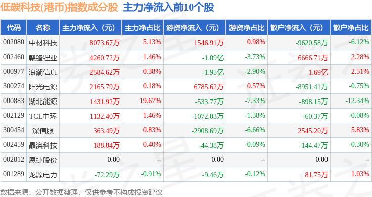 资金流向方面,低碳科技(港币)(983161)指数成份股当日主力资金净流出合计38.27亿元,游资资金净流入合计7.42亿元,散户资金净流入合计30.84亿元。成份股资金流向详情见下表: