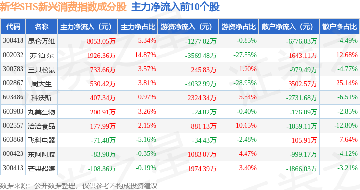 资金流向方面,新华SHS新兴消费(989006)指数成份股当日主力资金净流出合计14.82亿元,游资资金净流入合计3.13亿元,散户资金净流入合计11.69亿元。成份股资金流向详情见下表: