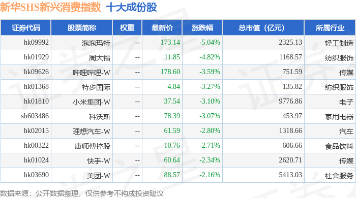 新华SHS新兴消费(989006)指数十大成份股详情如下: