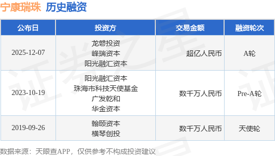 证券之星消息,根据天眼查APP于12月7日公布的信息整理,宁康瑞珠生物制药(珠海)有限公司A轮融资,融资额超亿人民币,参与投资的机构包括龙磐投资,峰瑞资本,阳光融汇资本。