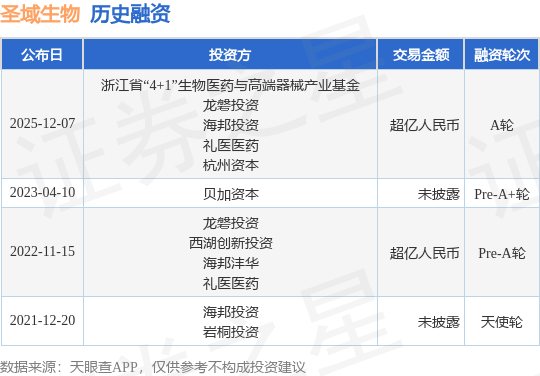 证券之星消息,根据天眼查APP于12月7日公布的信息整理,杭州圣域生物医药科技有限公司A轮融资,融资额超亿人民币,参与投资的机构包括浙江省“4+1”生物医药与高端器械产业基金,龙磐投资,海邦投资,礼医医药,杭州资本。