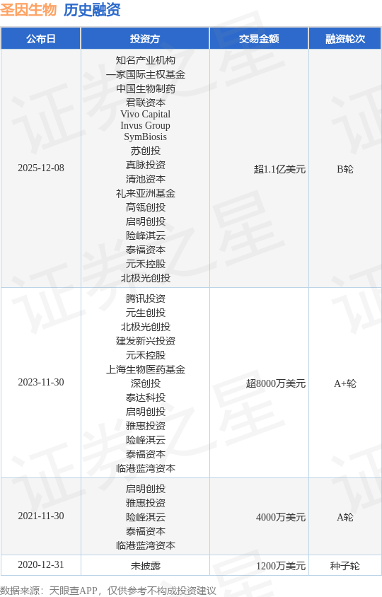 证券之星消息,根据天眼查APP于12月8日公布的信息整理,苏州圣因生物医药有限公司B轮融资,融资额超1.1亿美元,参与投资的机构包括知名产业机构,一家国际主权基金,中国生物制药,君联资本,Vivo Capital,Invus Group,SymBiosis,苏创投,真脉投资,清池资本,礼来亚洲基金,高瓴创投,启明创投,险峰淇云,泰福资本,元禾控股,北极光创投。