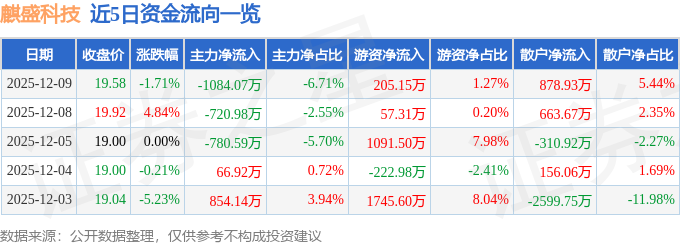证券之星消息,截至2025年12月9日收盘,麒盛科技(603610)报收于19.58元,下跌1.71%,换手率2.32%,成交量8.19万手,成交额1.62亿元。