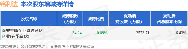 证券之星消息,12月9日铭利达发布公告《铭利达:关于持股5%以上股东减持股份比例触及1%整数倍的公告》,其股东泰安赛晖企业管理合伙企业(有限合伙)于2025年12月5日至2025年12月8日间合计减持34.24万股,占公司目前总股本的0.0855%,变动期间该股股价上涨0.67%,截止12月8日收盘报19.49元。