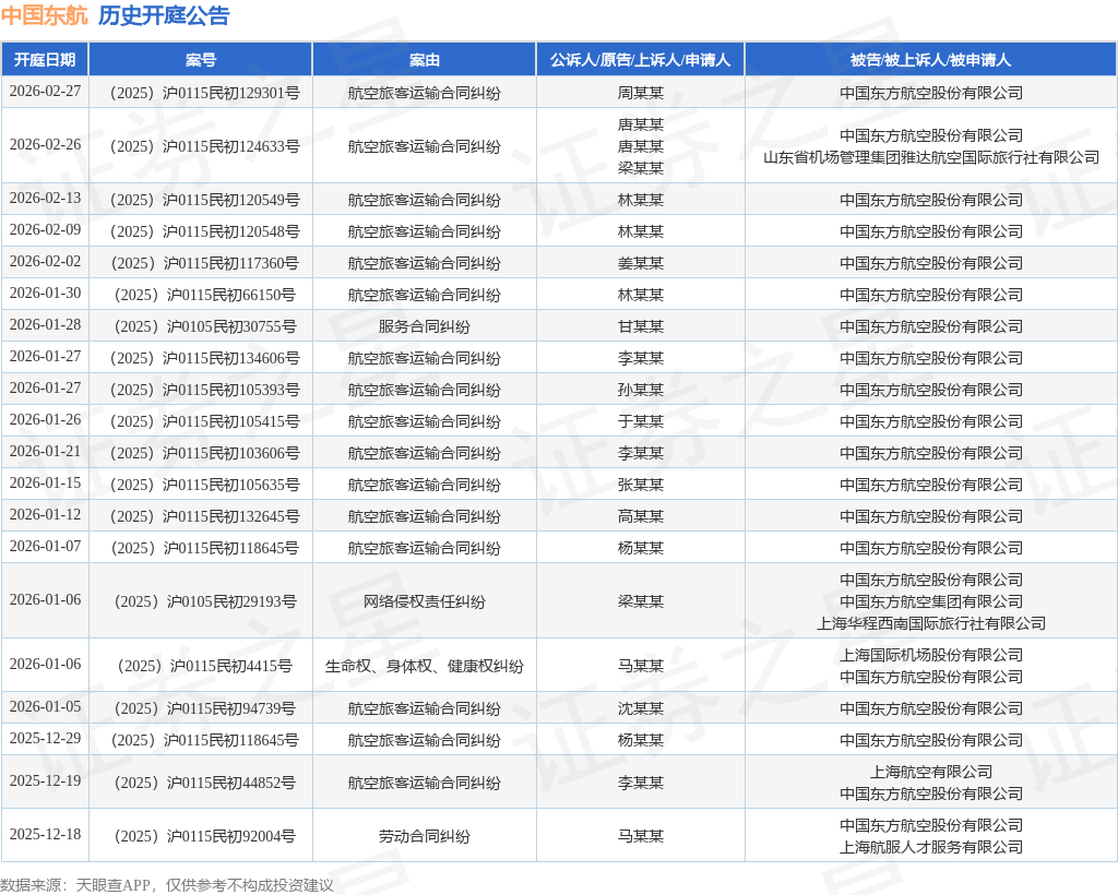 案号:(2025)沪0115民初124743号根据统计,近一年内以中国东方航空股份有限公司为当事人的历史开庭公告有207则,其中案由为“航空旅客运输合同纠纷”的公告以111则居首,其次为“不当得利纠纷”有45则,“生命权、身体权、健康权纠纷”有8则。历史开庭公告(前20条)如下: