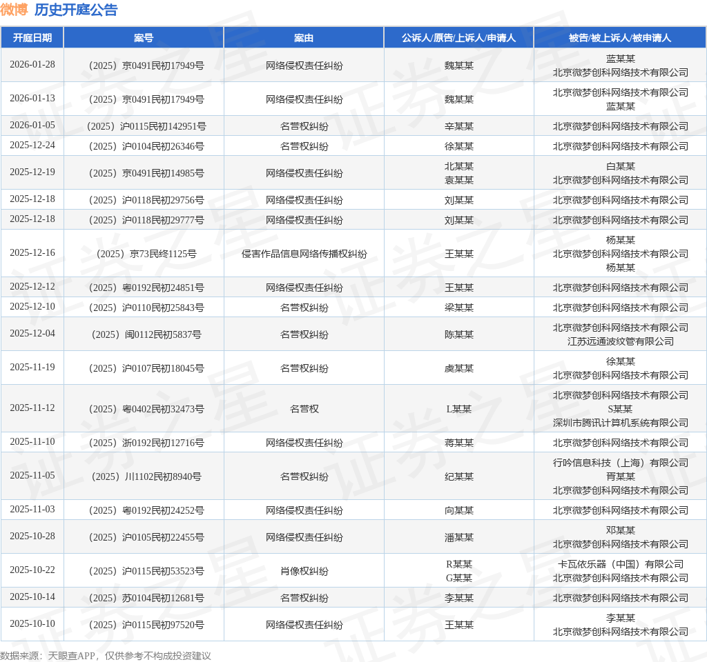 案号:(2025)粤0192民初24851号根据统计,近一年内以北京微梦创科网络技术有限公司为当事人的历史开庭公告有147则,其中案由为“网络侵权责任纠纷”的公告以58则居首,其次为“名誉权纠纷”有49则,“侵害作品信息网络传播权纠纷”有9则。历史开庭公告(前20条)如下: