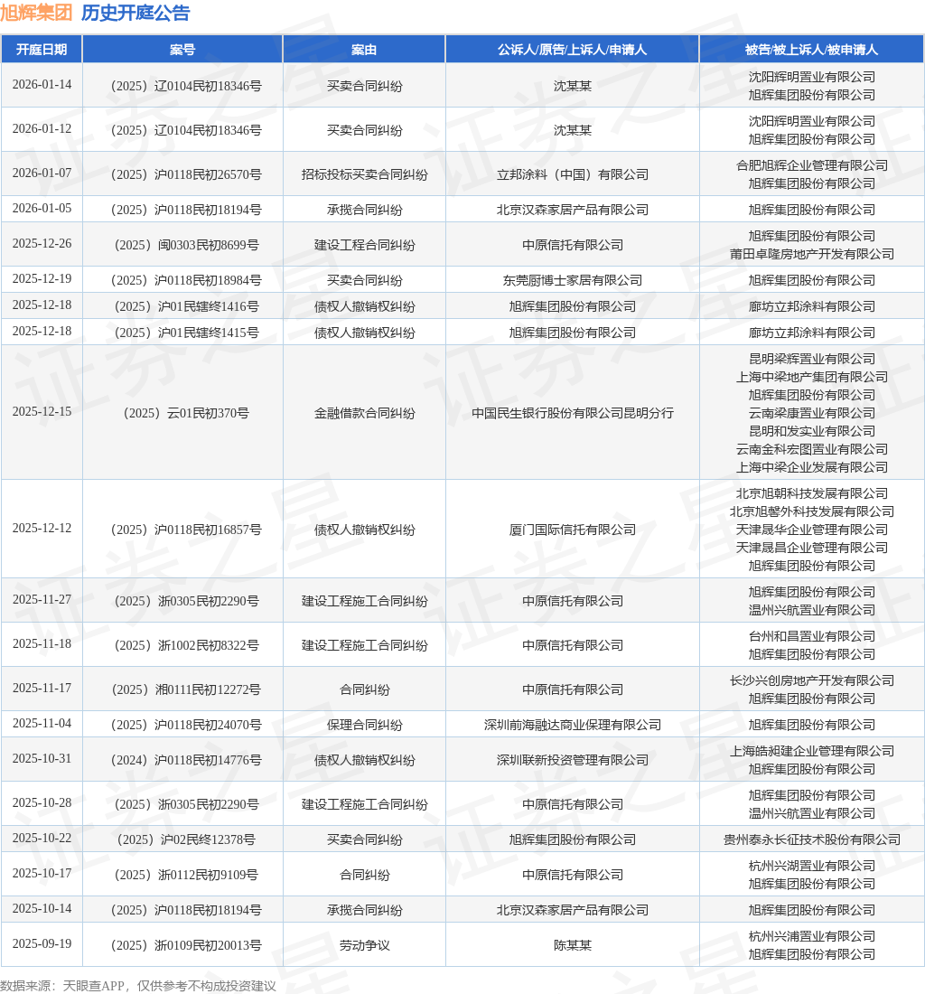 案号:(2025)沪0118民初16857号根据统计,近一年内以旭辉集团股份有限公司为当事人的历史开庭公告有91则,其中案由为“债权人撤销权纠纷”的公告以12则居首,其次为“买卖合同纠纷”有11则,“金融借款合同纠纷”有10则。历史开庭公告(前20条)如下: