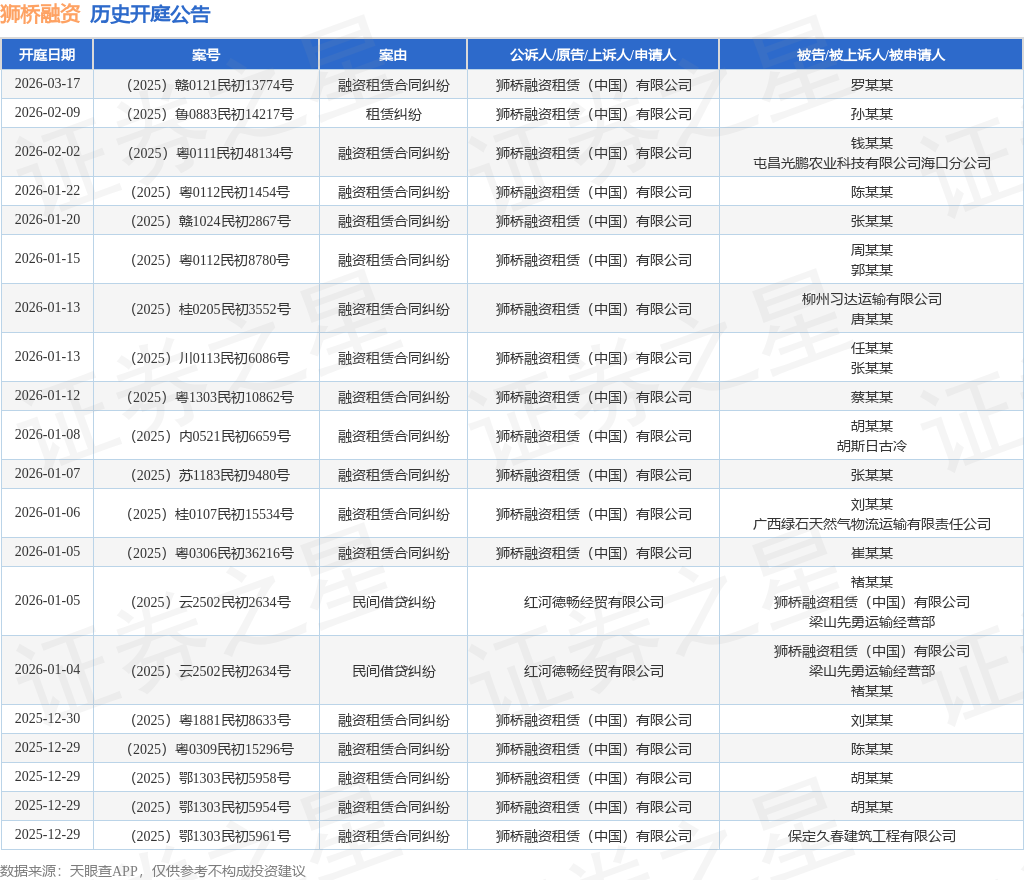 证券之星消息,根据天眼查APP显示,近日公布了一则狮桥融资租赁(中国)有限公司作为原告/上诉人的开庭公告,详细内容如下: