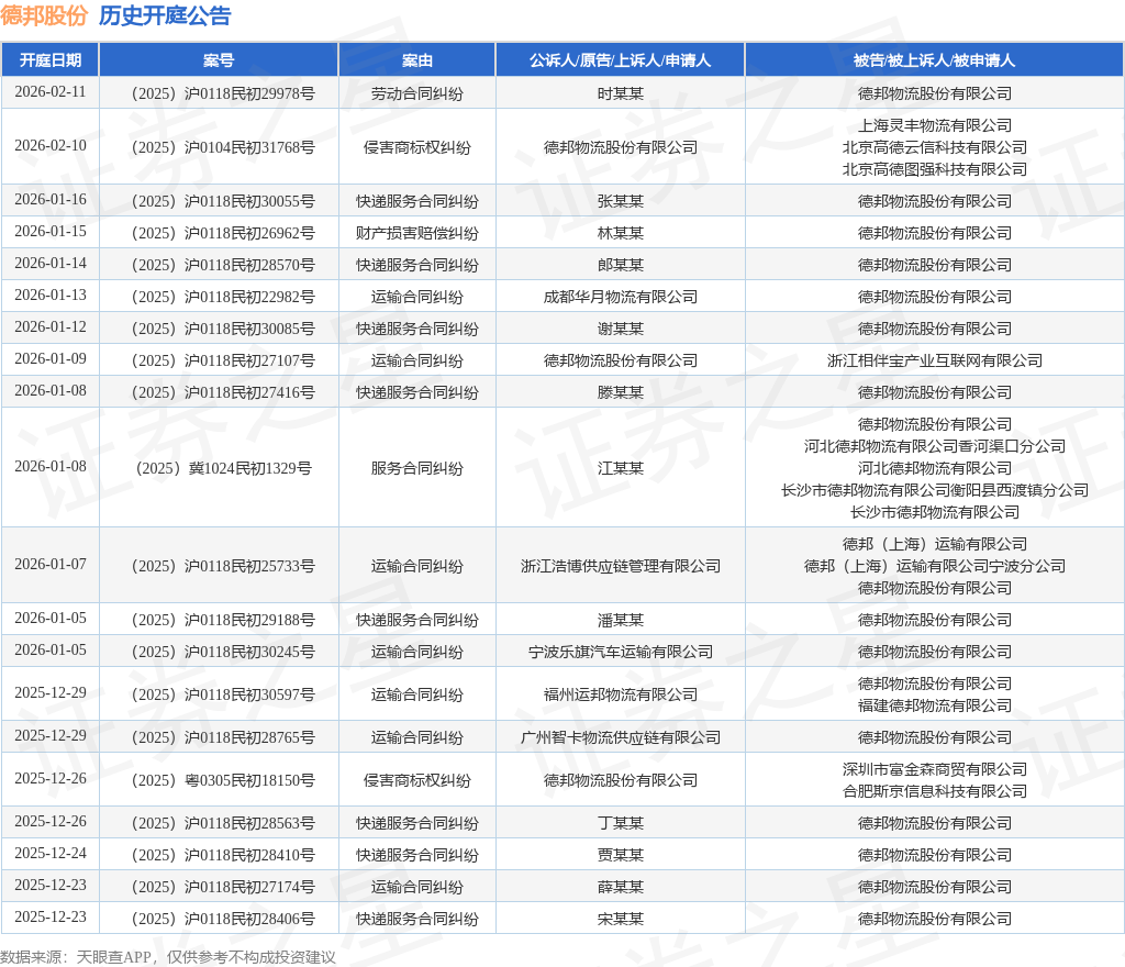 案号:(2025)闽01民终8317号根据统计,近一年内以德邦物流股份有限公司为当事人的历史开庭公告有383则,其中案由为“快递服务合同纠纷”的公告以115则居首,其次为“运输合同纠纷”有79则,“劳动争议”有29则。历史开庭公告(前20条)如下:
