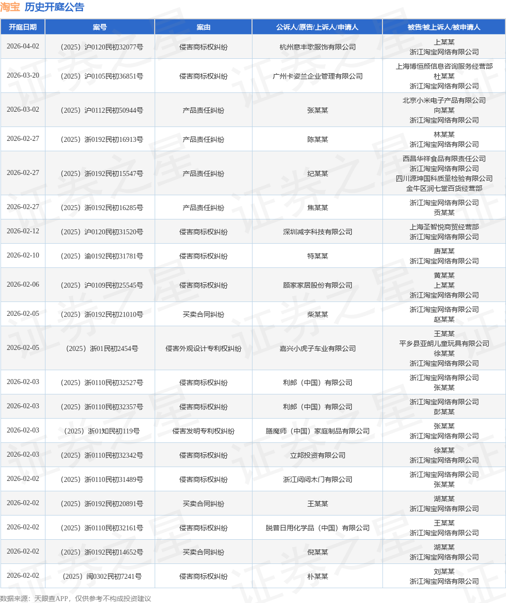 案号:(2025)赣1104民初7252号根据统计,近一年内以浙江淘宝网络有限公司为当事人的历史开庭公告有7274则,其中案由为“侵害商标权纠纷”的公告以3305则居首,其次为“网络服务合同纠纷”有644则,“侵害外观设计专利权纠纷”有531则。历史开庭公告(前20条)如下: