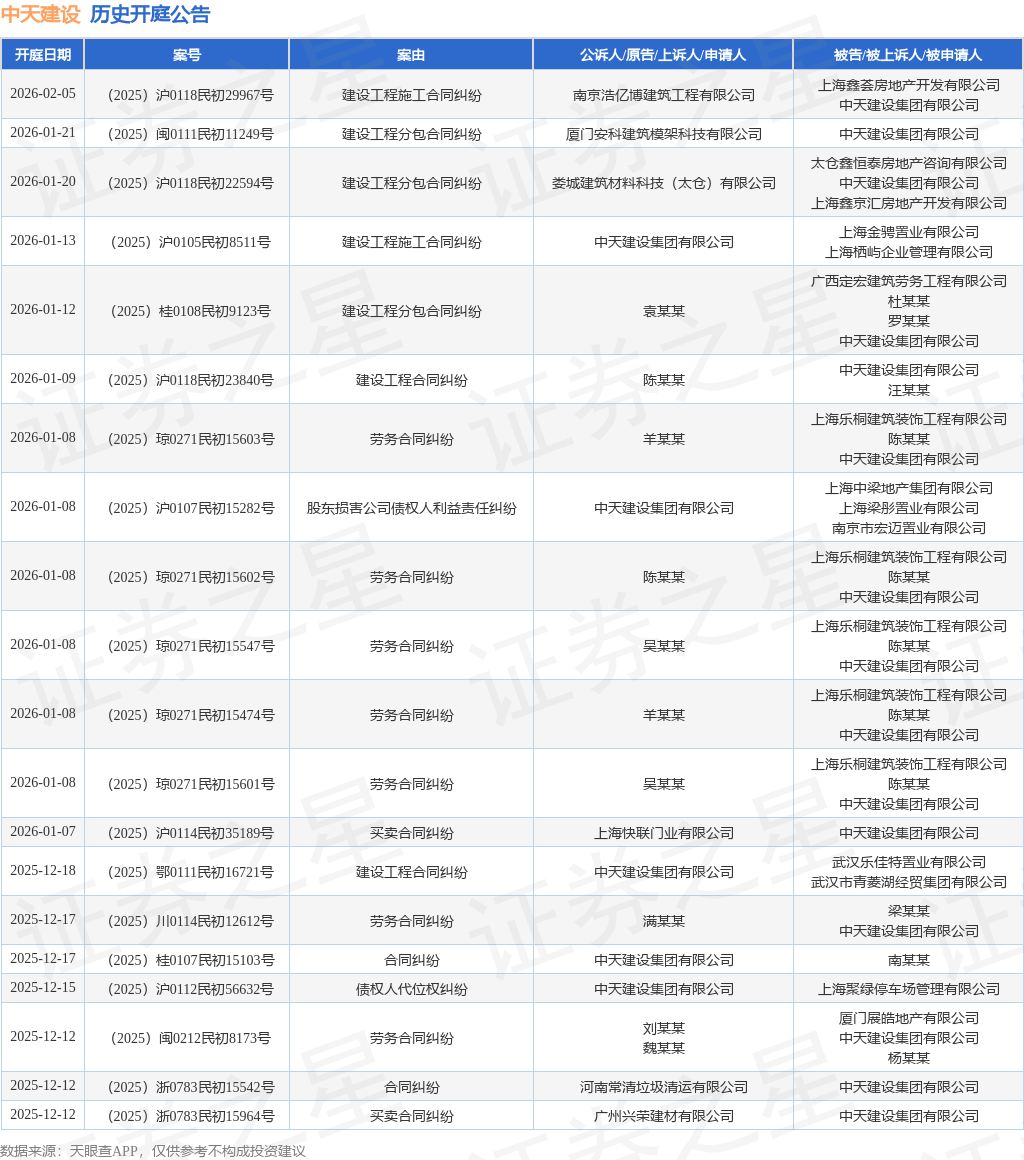 案号:(2025)闽0212民初8173号根据统计,近一年内以中天建设集团有限公司为当事人的历史开庭公告有1500则,其中案由为“买卖合同纠纷”的公告以485则居首,其次为“建设工程施工合同纠纷”有218则,“建设工程分包合同纠纷”有164则。历史开庭公告(前20条)如下: