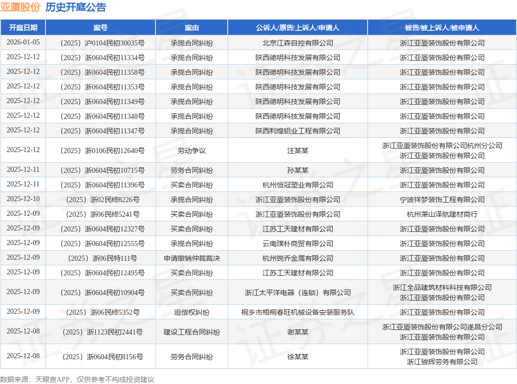 案号:(2025)浙0106民初12640号根据统计,近一年内以浙江亚厦装饰股份有限公司为当事人的历史开庭公告有593则,其中案由为“买卖合同纠纷”的公告以212则居首,其次为“劳务合同纠纷”有112则,“建设工程施工合同纠纷”有59则。历史开庭公告(前20条)如下: