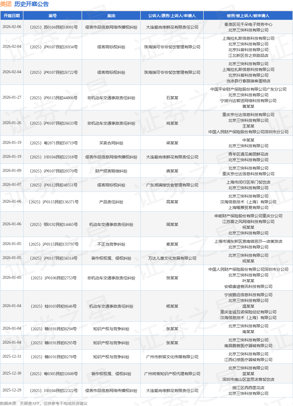 案号:(2025)粤0305民初32608号根据统计,近一年内以北京三快科技有限公司为当事人的历史开庭公告有681则,其中案由为“非机动车交通事故责任纠纷”的公告以181则居首,其次为“侵害商标权纠纷”有140则,“机动车交通事故责任纠纷”有88则。历史开庭公告(前20条)如下: