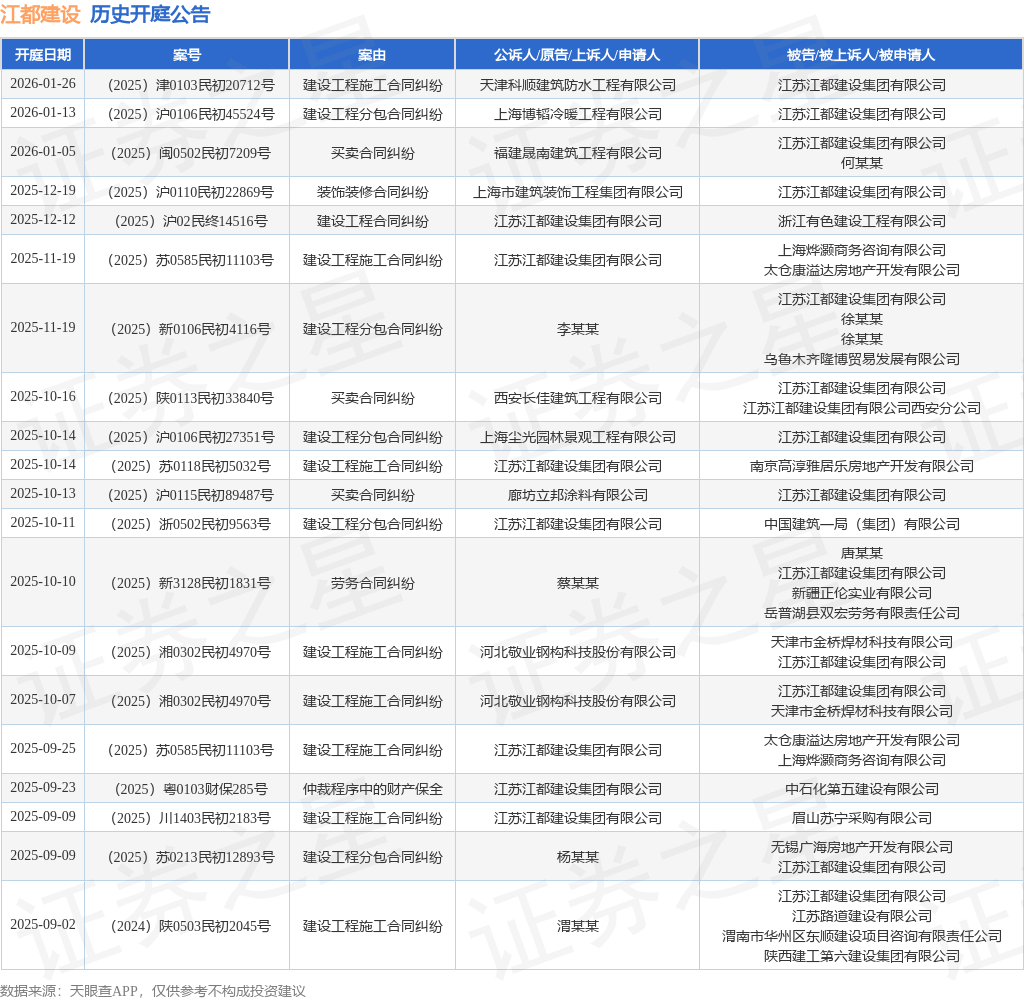 案号:(2025)沪02民终14516号根据统计,近一年内以江苏江都建设集团有限公司为当事人的历史开庭公告有221则,其中案由为“建设工程施工合同纠纷”的公告以47则居首,其次为“买卖合同纠纷”有42则,“劳务合同纠纷”有31则。历史开庭公告(前20条)如下: