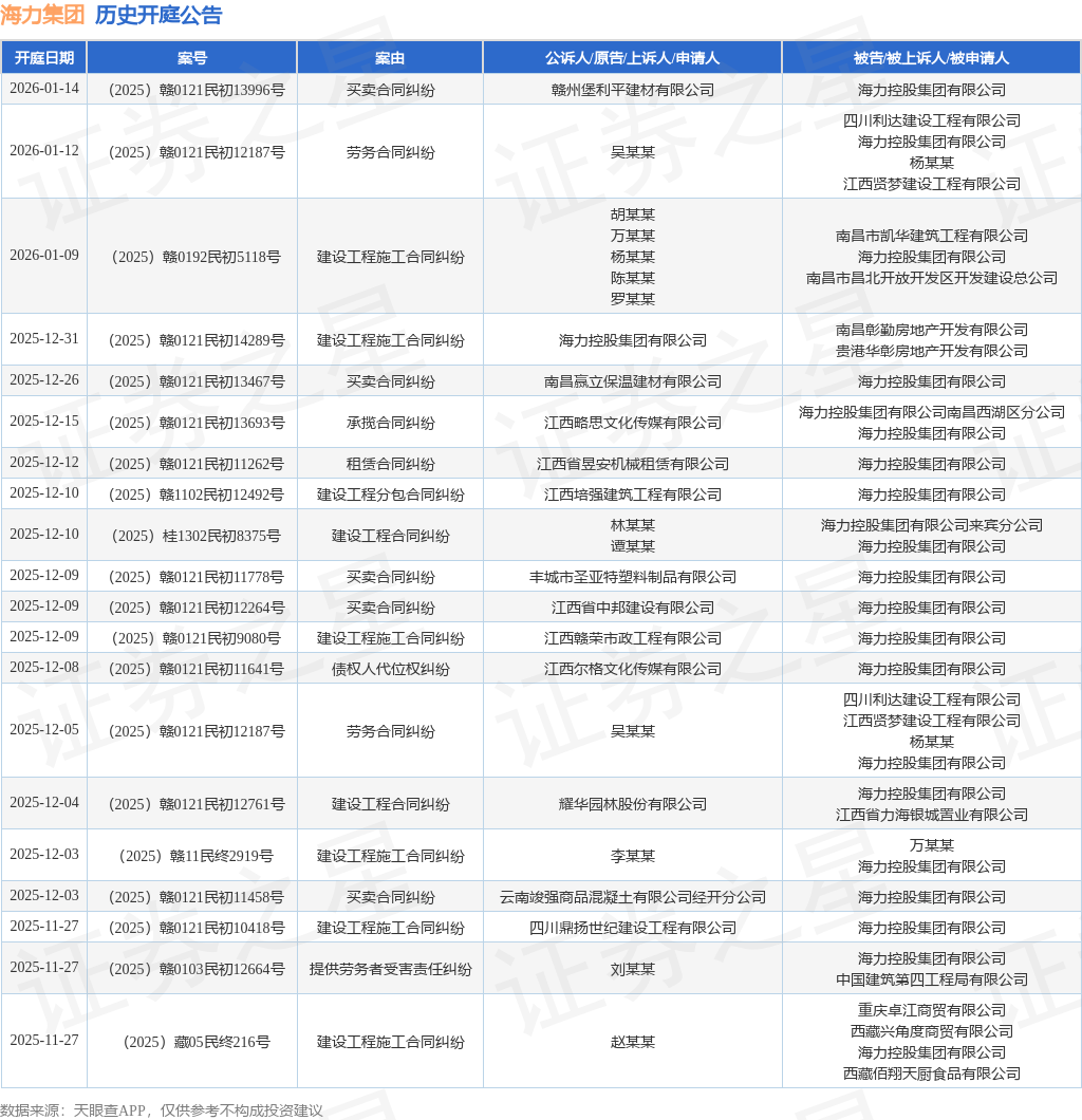 案号:(2025)赣0121民初11262号根据统计,近一年内以海力控股集团有限公司为当事人的历史开庭公告有205则,其中案由为“买卖合同纠纷”的公告以61则居首,其次为“建设工程施工合同纠纷”有41则,“劳务合同纠纷”有17则。历史开庭公告(前20条)如下: