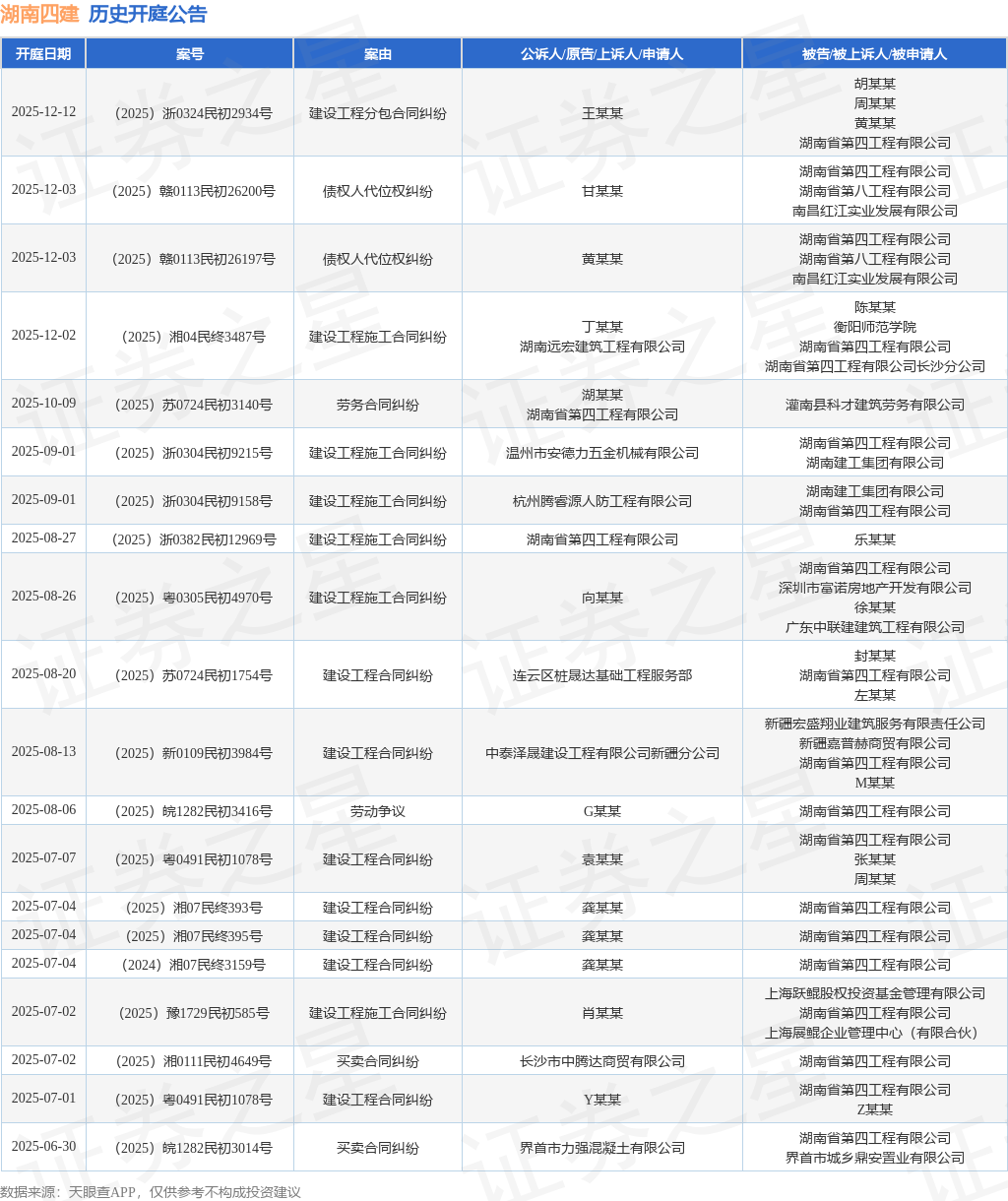 案号:(2025)浙0324民初2934号根据统计,近一年内以湖南省第四工程有限公司为当事人的历史开庭公告有57则,其中案由为“建设工程施工合同纠纷”的公告以16则居首,其次为“建设工程合同纠纷”有12则,“买卖合同纠纷”有9则。历史开庭公告(前20条)如下: