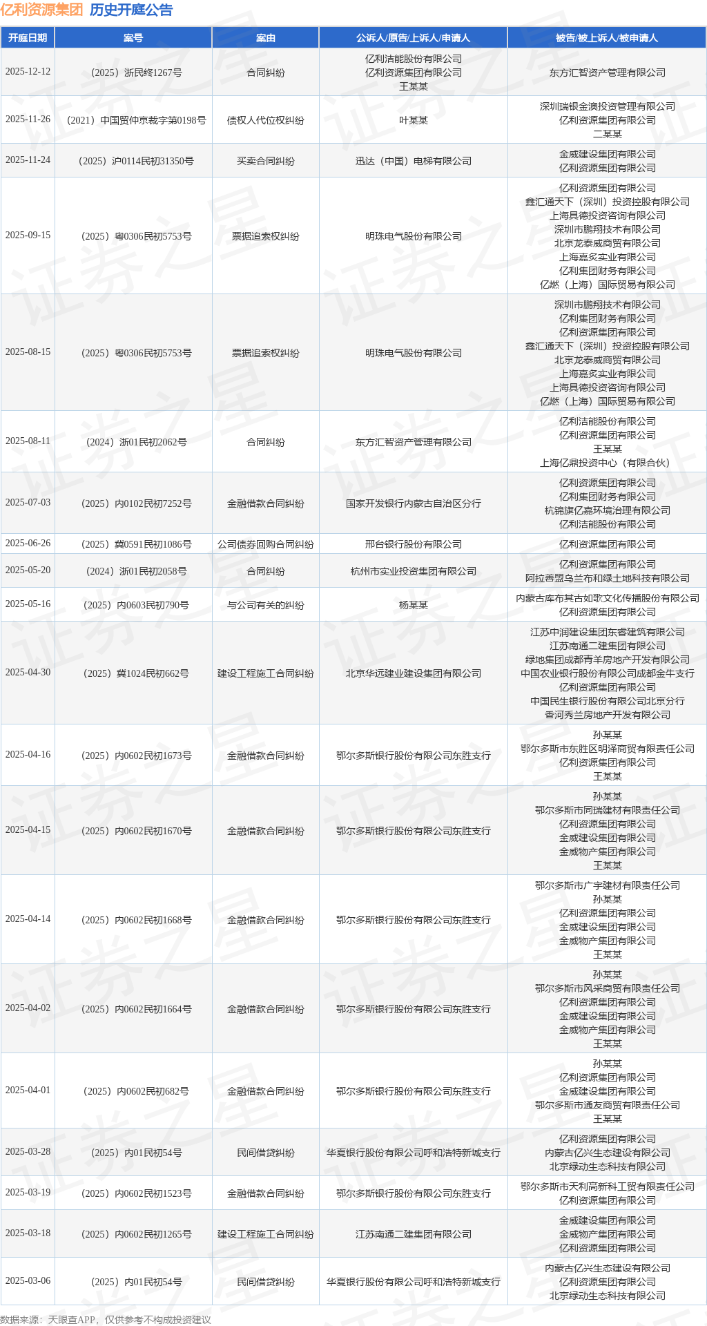 根据统计,近一年内以亿利资源集团有限公司为当事人的历史开庭公告有26则,其中案由为“金融借款合同纠纷”的公告以11则居首,其次为“合同纠纷”有3则,“劳动争议”有2则。历史开庭公告(前20条)如下: