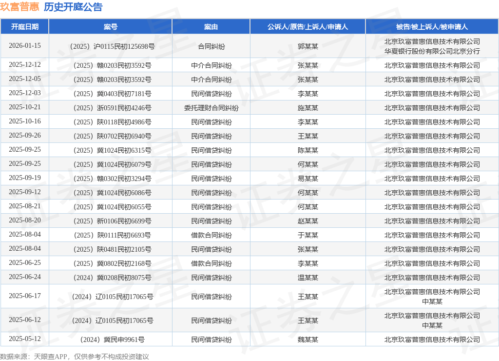 案号:(2025)赣0203民初3592号根据统计,近一年内以北京玖富普惠信息技术有限公司为当事人的历史开庭公告有54则,其中案由为“民间借贷纠纷”的公告以36则居首,其次为“借款合同纠纷”有7则,“中介合同纠纷”有5则。历史开庭公告(前20条)如下: