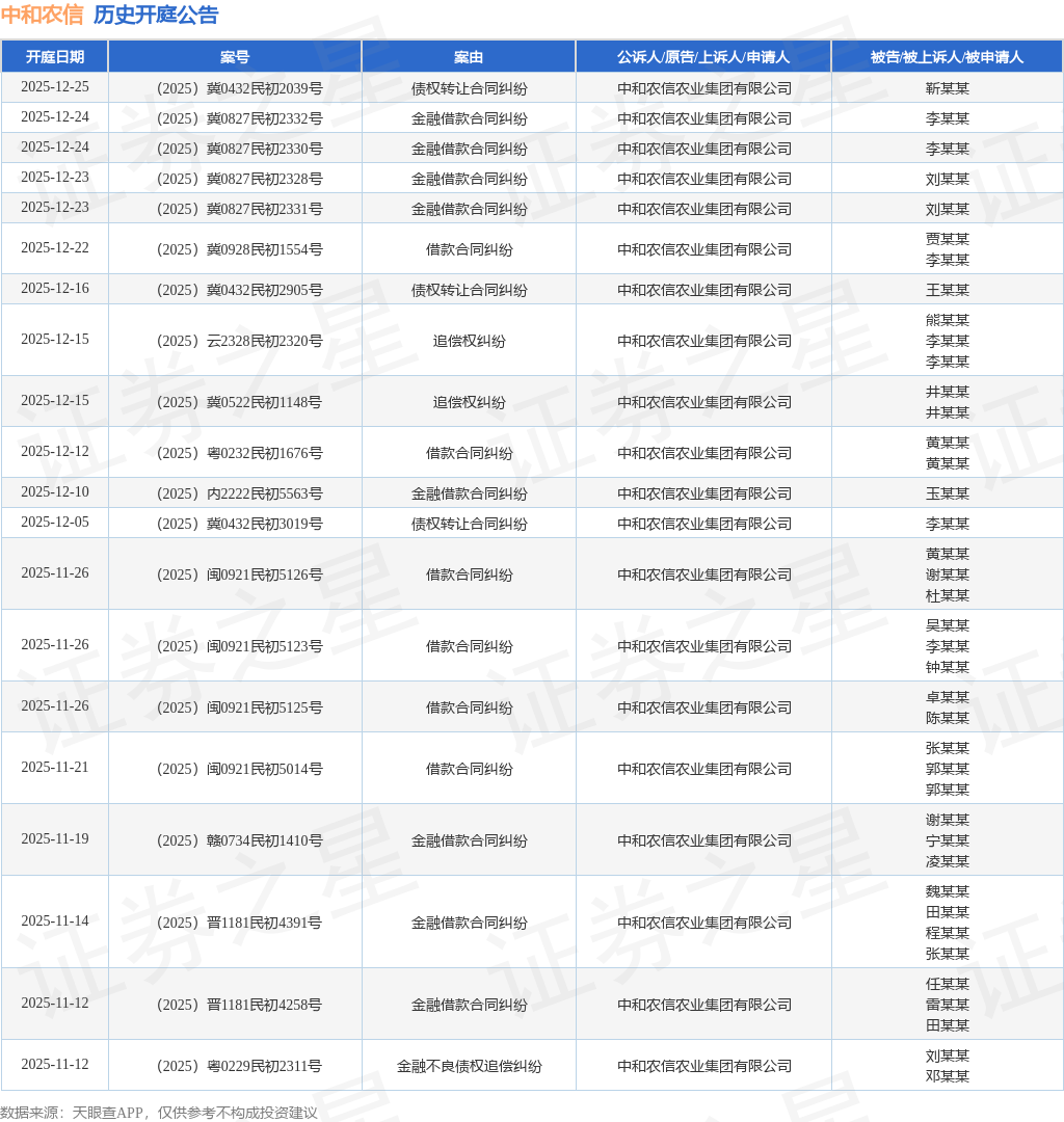 案号:(2025)粤0232民初1676号根据统计,近一年内以中和农信农业集团有限公司为当事人的历史开庭公告有412则,其中案由为“借款合同纠纷”的公告以135则居首,其次为“金融借款合同纠纷”有105则,“追偿权纠纷”有79则。历史开庭公告(前20条)如下: