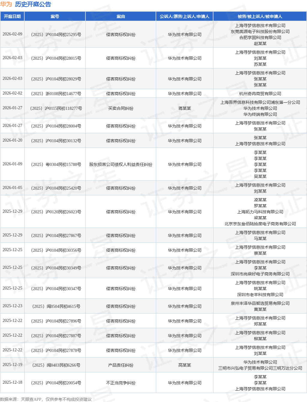 案号:(2025)粤0304民初15788号根据统计,近一年内以华为技术有限公司为当事人的历史开庭公告有353则,其中案由为“侵害商标权纠纷”的公告以239则居首,其次为“不正当竞争纠纷”有29则,“侵害作品信息网络传播权纠纷”有17则。历史开庭公告(前20条)如下: