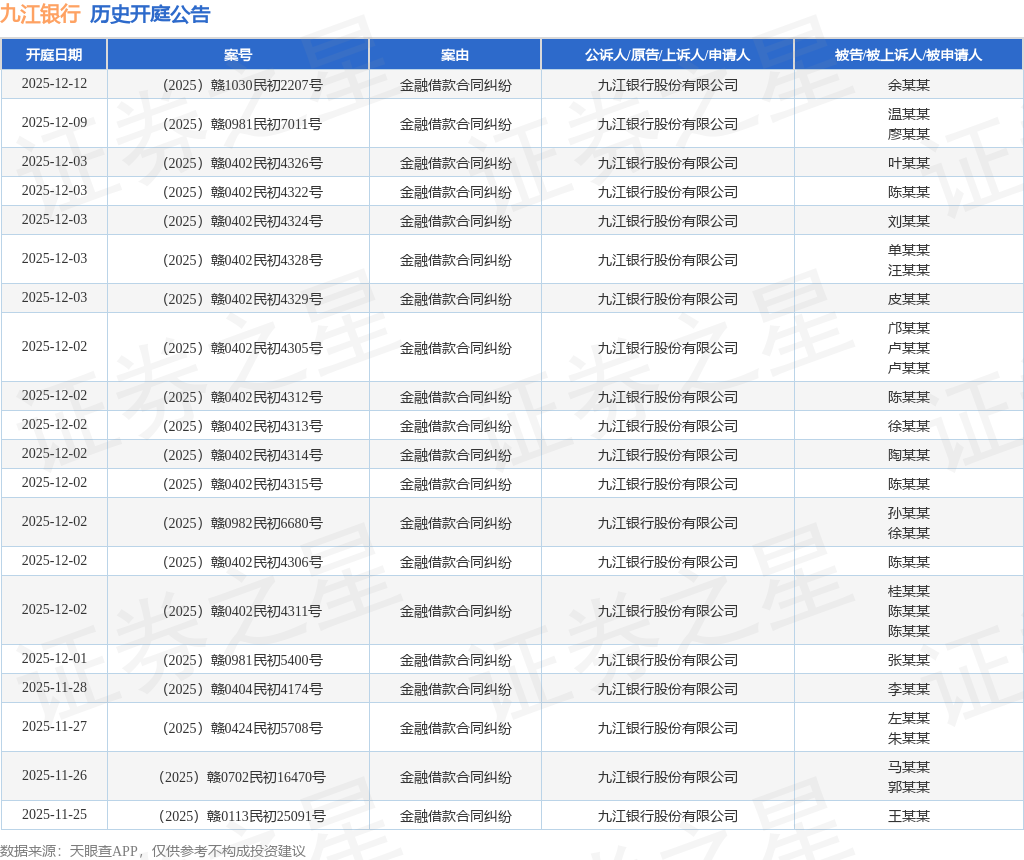 案号:(2025)赣1030民初2207号根据统计,近一年内以九江银行股份有限公司为当事人的历史开庭公告有765则,其中案由为“金融借款合同纠纷”的公告以682则居首,其次为“借款”有66则,“房屋买卖合同纠纷”有6则。历史开庭公告(前20条)如下: