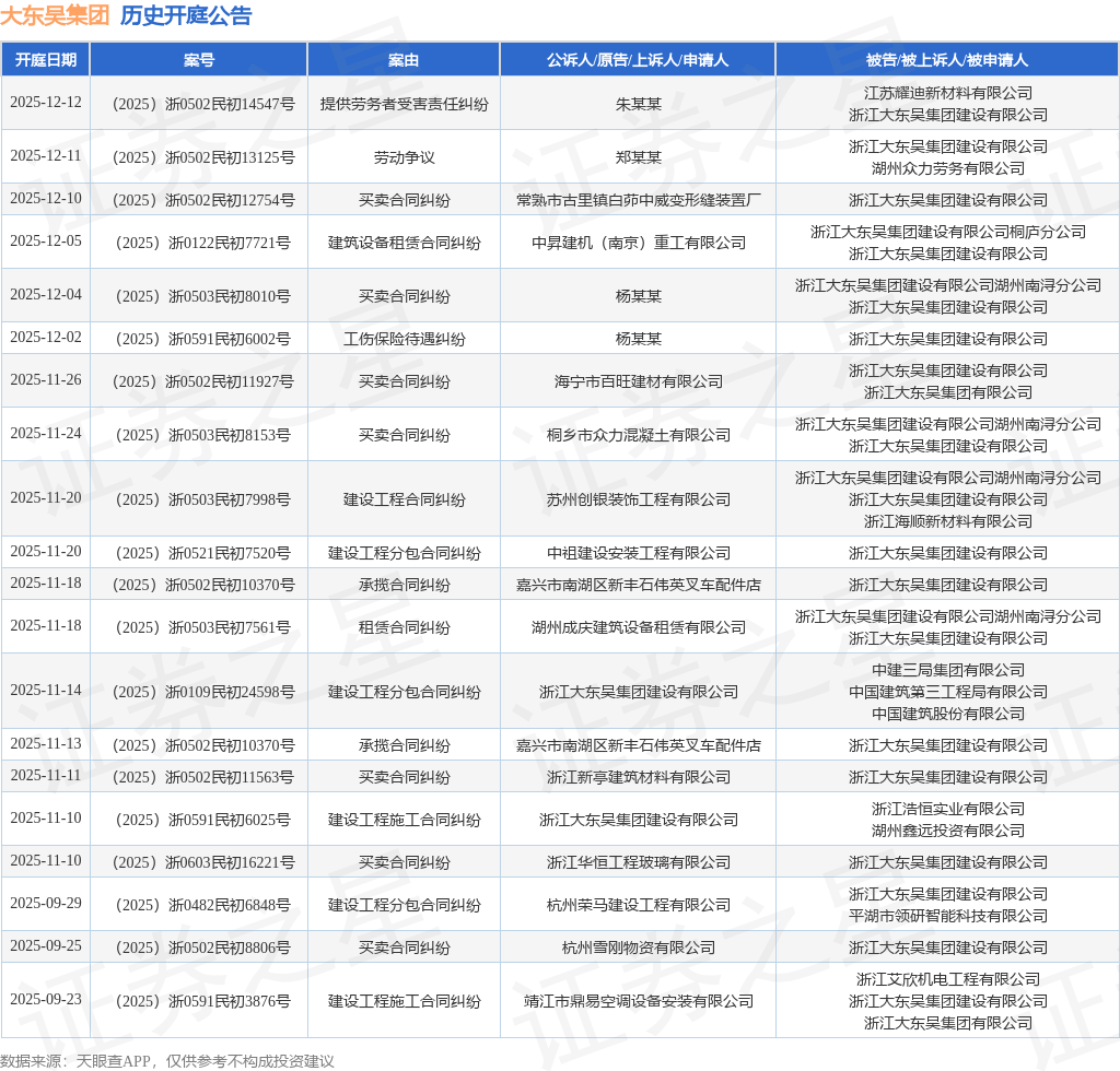 案号:(2025)浙0502民初14547号根据统计,近一年内以浙江大东吴集团建设有限公司为当事人的历史开庭公告有62则,其中案由为“买卖合同纠纷”的公告以12则居首,其次为“建设工程施工合同纠纷”有11则,“建设工程合同纠纷”有7则。历史开庭公告(前20条)如下: