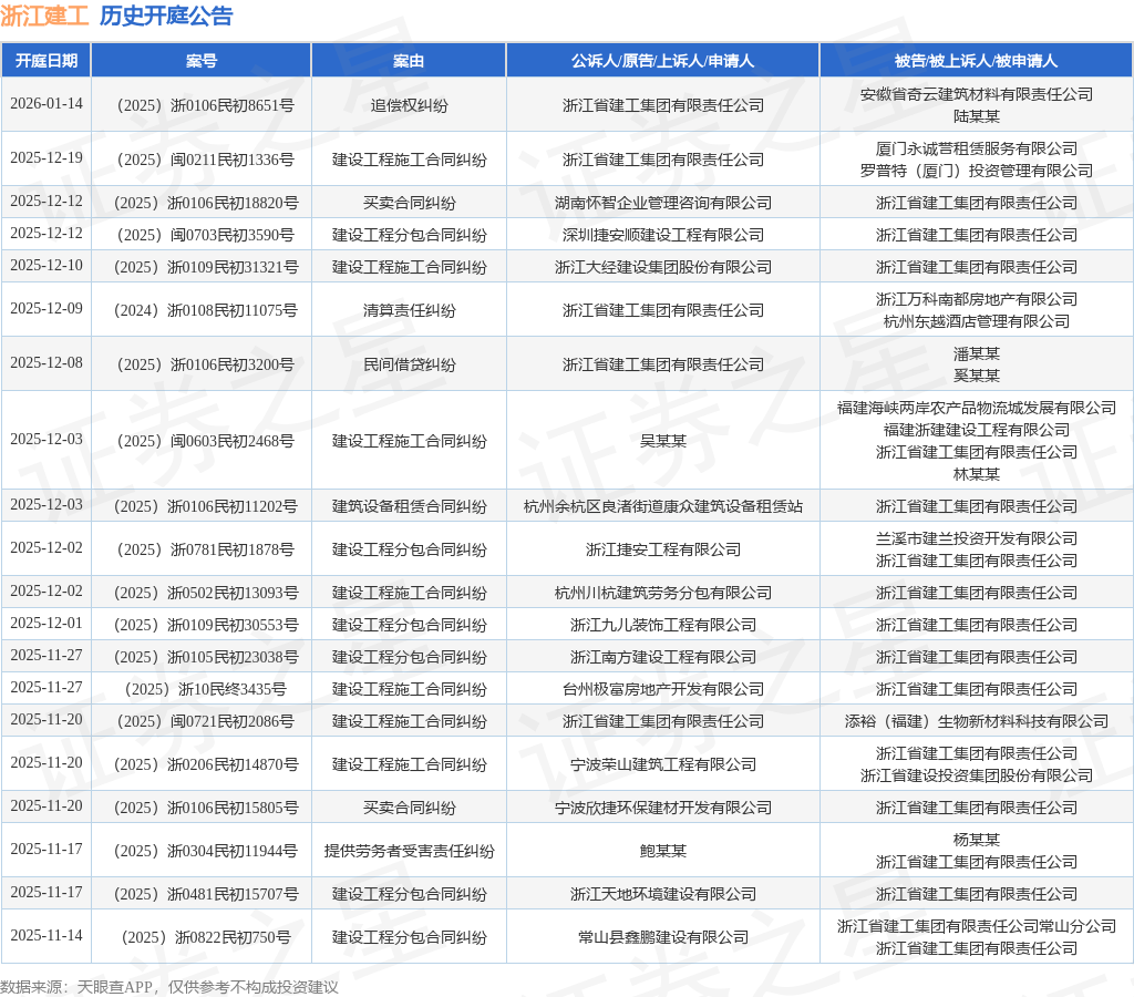 案号:(2025)浙0106民初18820号根据统计,近一年内以浙江省建工集团有限责任公司为当事人的历史开庭公告有395则,其中案由为“建设工程施工合同纠纷”的公告以126则居首,其次为“买卖合同纠纷”有75则,“建设工程分包合同纠纷”有59则。历史开庭公告(前20条)如下: