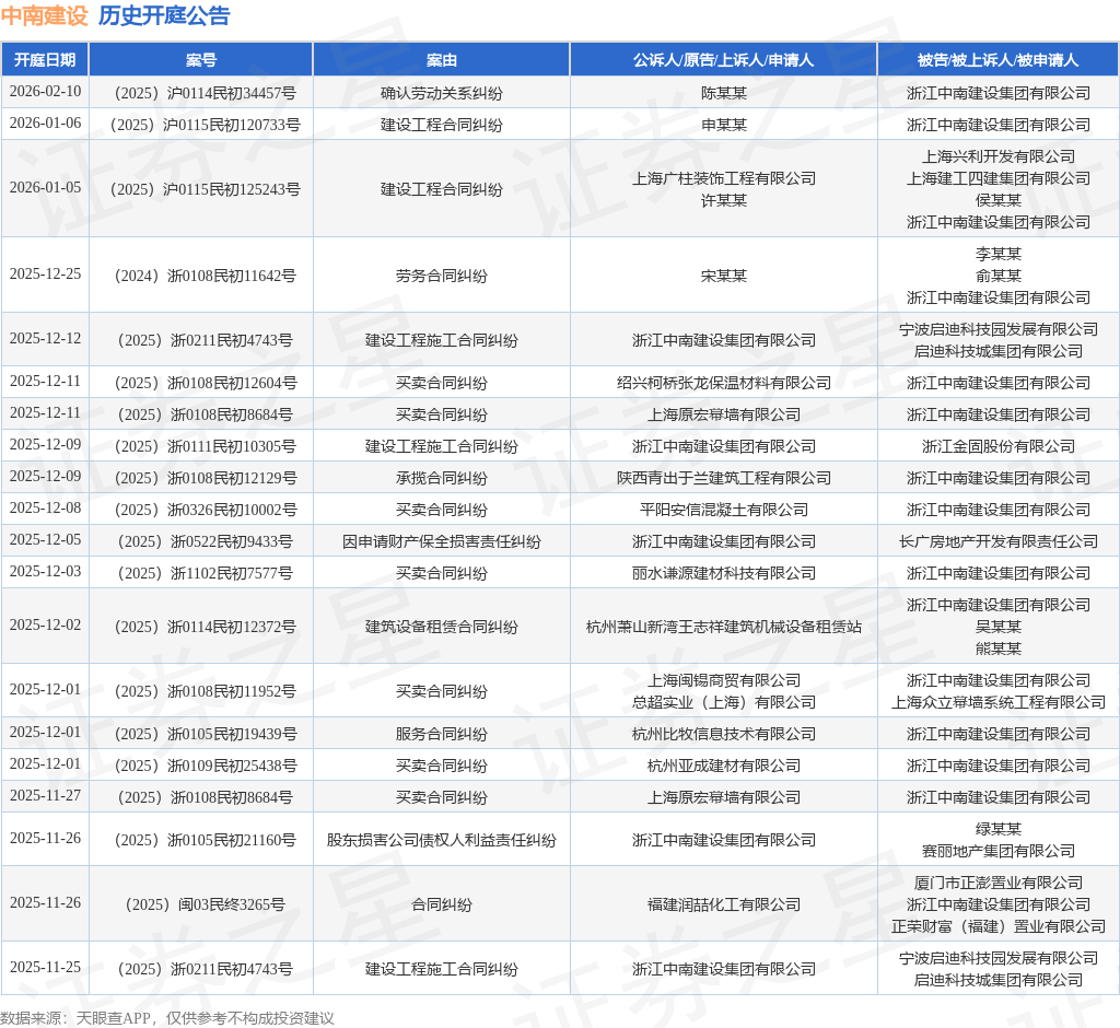 案号:(2025)浙0211民初4743号根据统计,近一年内以浙江中南建设集团有限公司为当事人的历史开庭公告有310则,其中案由为“买卖合同纠纷”的公告以79则居首,其次为“建设工程施工合同纠纷”有59则,“建设工程分包合同纠纷”有42则。历史开庭公告(前20条)如下: