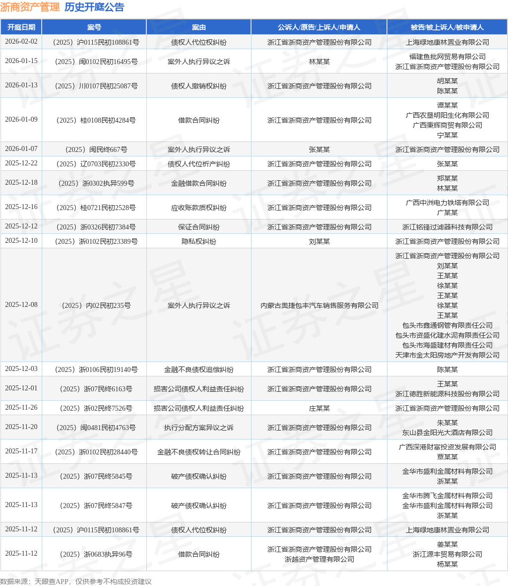 案号:(2025)浙0326民初7384号根据统计,近一年内以浙江省浙商资产管理股份有限公司为当事人的历史开庭公告有215则,其中案由为“案外人执行异议之诉”的公告以36则居首,其次为“清算责任纠纷”有16则,“合同纠纷”有15则。历史开庭公告(前20条)如下: