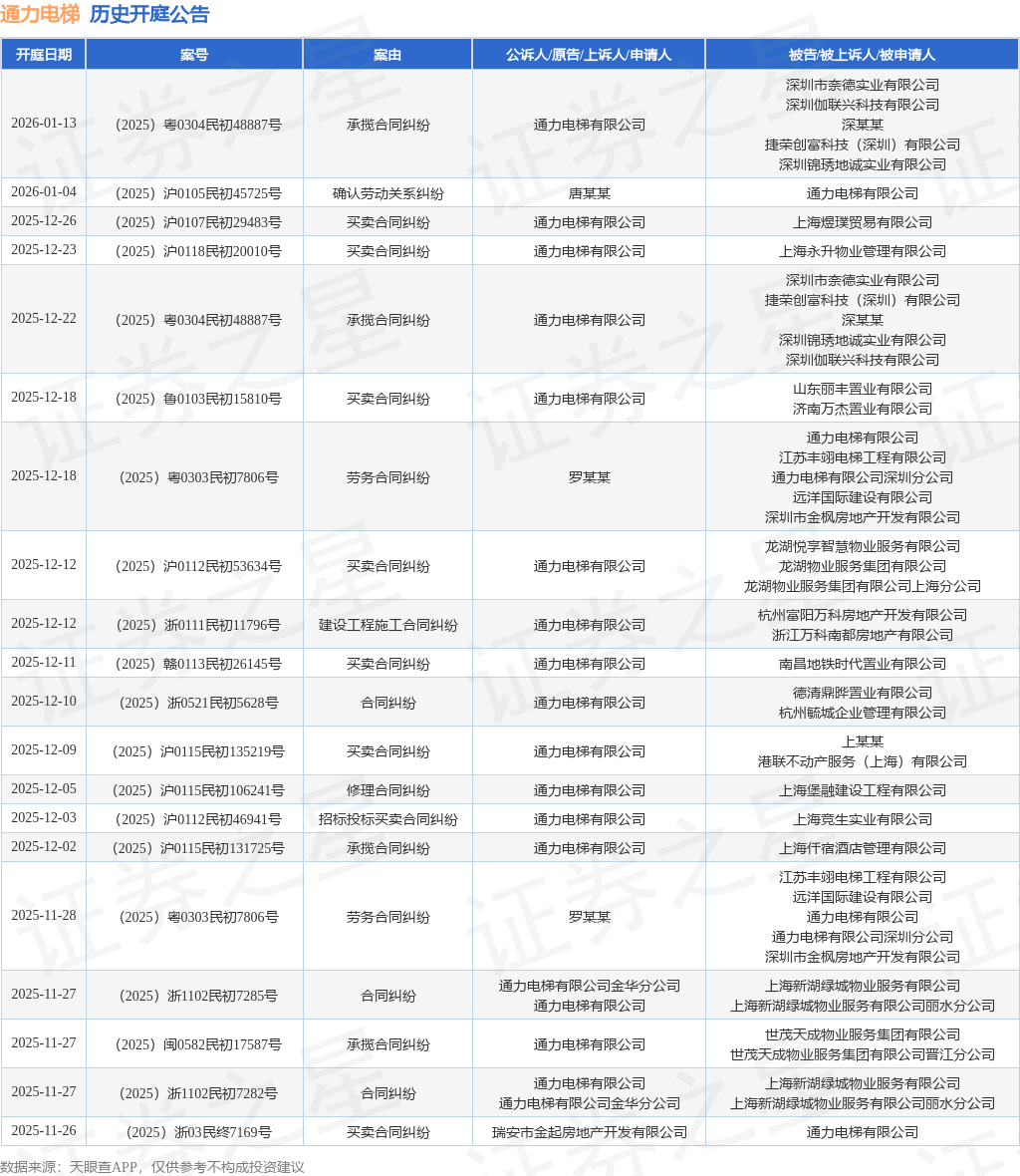 案号:(2025)沪0112民初53634号根据统计,近一年内以通力电梯有限公司为当事人的历史开庭公告有278则,其中案由为“买卖合同纠纷”的公告以159则居首,其次为“承揽合同纠纷”有39则,“合同纠纷”有28则。历史开庭公告(前20条)如下: