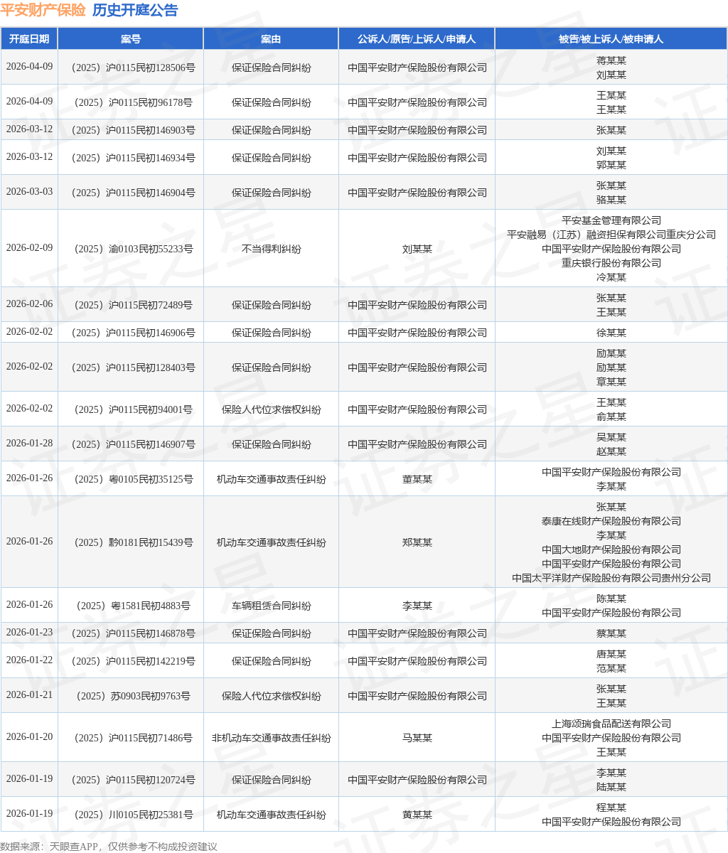 案号:(2025)沪0106民初31265号根据统计,近一年内以中国平安财产保险股份有限公司为当事人的历史开庭公告有2150则,其中案由为“机动车交通事故责任纠纷”的公告以1037则居首,其次为“保证保险合同纠纷”有282则,“保险人代位求偿权纠纷”有178则。历史开庭公告(前20条)如下: