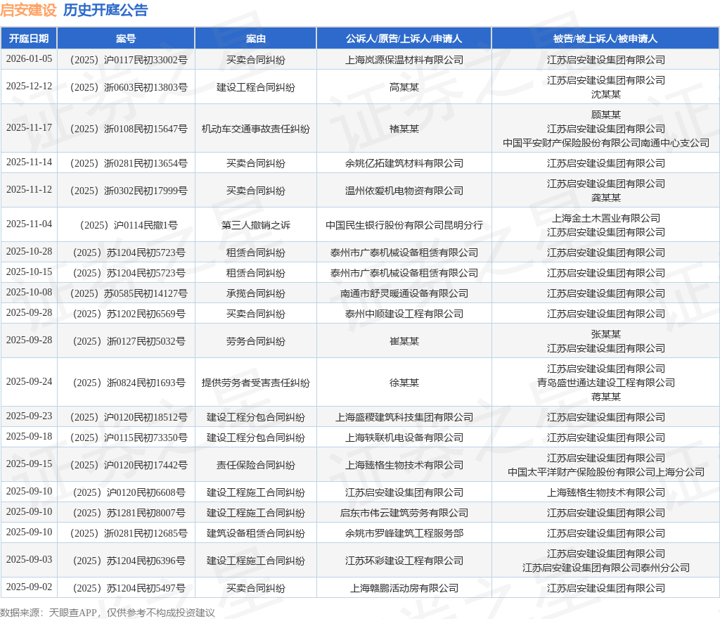 案号:(2025)浙0603民初13803号根据统计,近一年内以江苏启安建设集团有限公司为当事人的历史开庭公告有202则,其中案由为“建设工程施工合同纠纷”的公告以52则居首,其次为“买卖合同纠纷”有44则,“建设工程分包合同纠纷”有28则。历史开庭公告(前20条)如下: