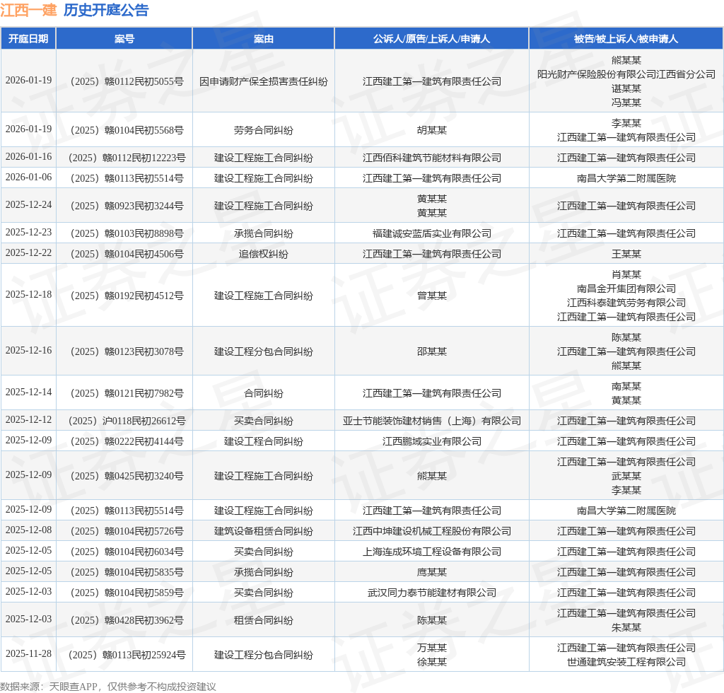 证券之星消息,根据天眼查APP显示,近日公布了一则江西建工第一建筑有限责任公司作为被告/被上诉人的开庭公告,详细内容如下: