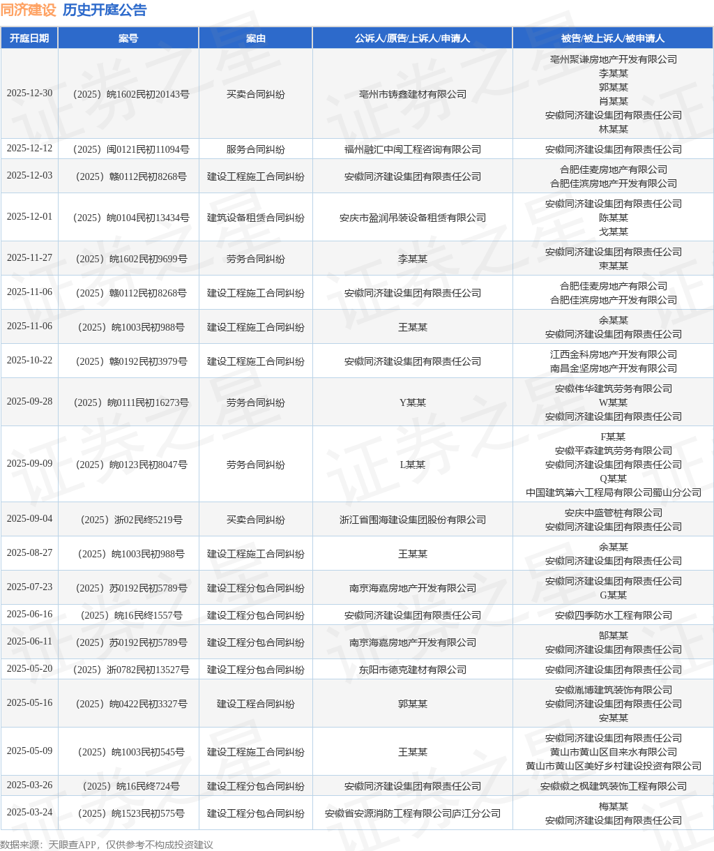 案号:(2025)闽0121民初11094号根据统计,近一年内以安徽同济建设集团有限责任公司为当事人的历史开庭公告有28则,其中案由为“建设工程分包合同纠纷”的公告以8则居首,其次为“建设工程施工合同纠纷”有8则,“买卖合同纠纷”有4则。历史开庭公告(前20条)如下: