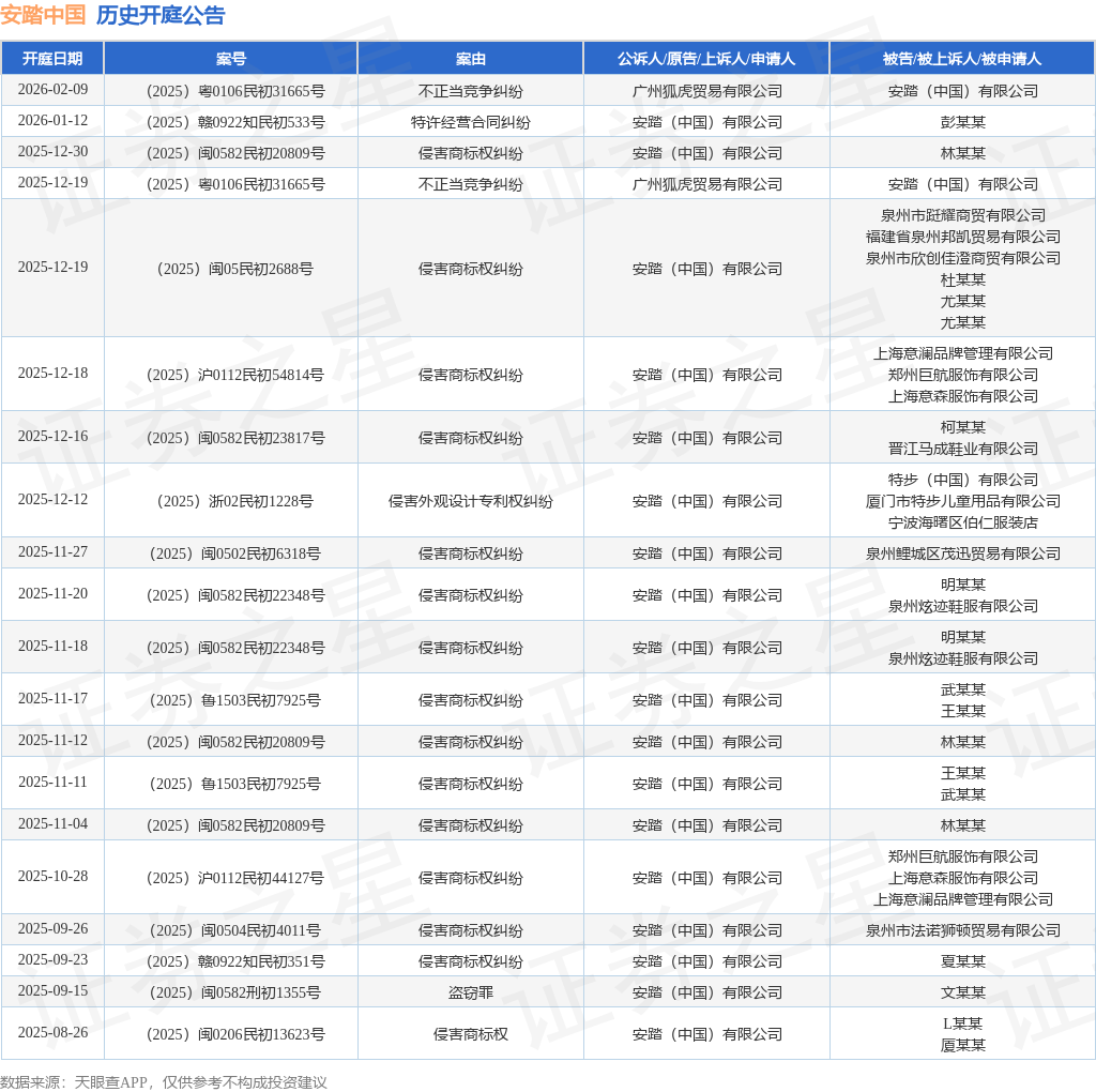 案号:(2025)浙02民初1228号根据统计,近一年内以安踏(中国)有限公司为当事人的历史开庭公告有30则,其中案由为“侵害商标权纠纷”的公告以18则居首,其次为“不正当竞争纠纷”有4则,“侵害外观设计专利权纠纷”有3则。历史开庭公告(前20条)如下: