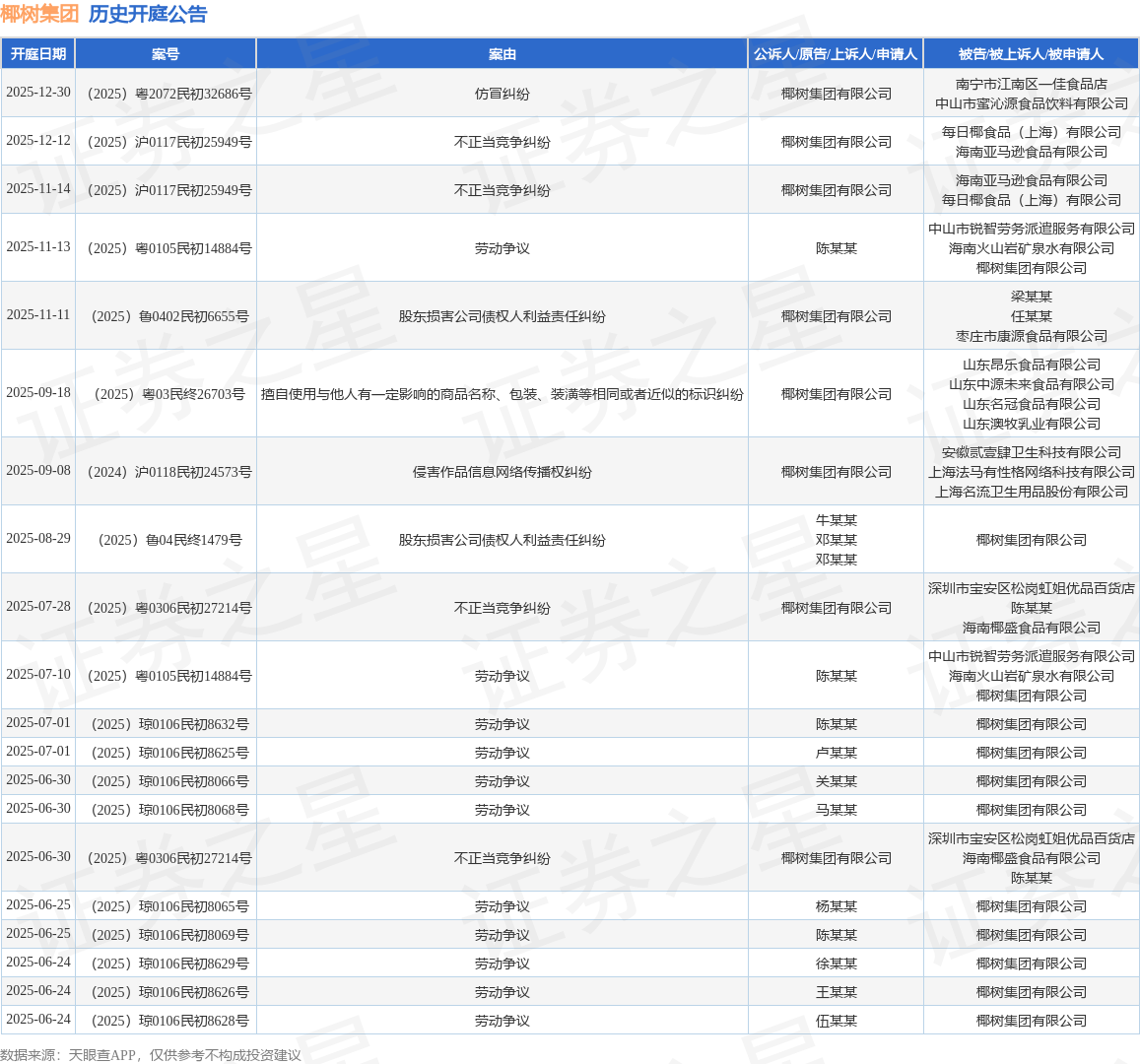 案号:(2025)沪0117民初25949号根据统计,近一年内以椰树集团有限公司为当事人的历史开庭公告有35则,其中案由为“劳动争议”的公告以15则居首,其次为“不正当竞争纠纷”有8则,“股东损害公司债权人利益责任纠纷”有4则。历史开庭公告(前20条)如下: