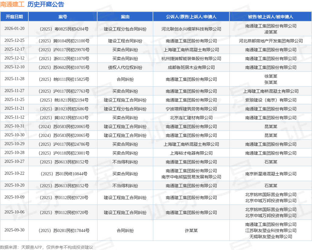 案号:(2025)浙0112民初11070号根据统计,近一年内以南通建工集团股份有限公司为当事人的历史开庭公告有295则,其中案由为“买卖合同纠纷”的公告以84则居首,其次为“建设工程施工合同纠纷”有54则,“建设工程分包合同纠纷”有39则。历史开庭公告(前20条)如下: