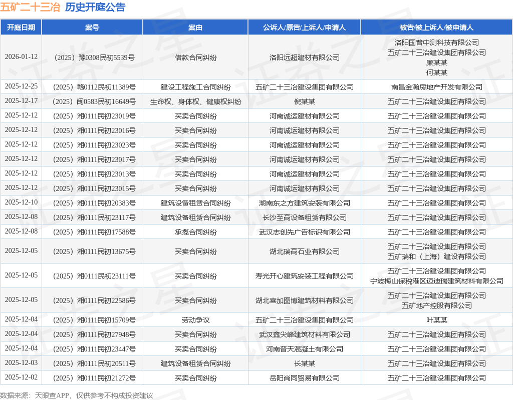 案号:(2025)湘0111民初20383号根据统计,近一年内以五矿二十三冶建设集团有限公司为当事人的历史开庭公告有483则,其中案由为“买卖合同纠纷”的公告以194则居首,其次为“建筑设备租赁合同纠纷”有105则,“建设工程施工合同纠纷”有36则。历史开庭公告(前20条)如下: