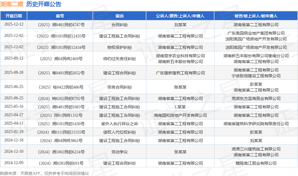 案号:(2025)湘0481民初4747号根据统计,近一年内以湖南省第二工程有限公司为当事人的历史开庭公告有14则,其中案由为“建设工程施工合同纠纷”的公告以5则居首,其次为“债权人代位权纠纷”有1则,“劳务合同纠纷”有1则。历史开庭公告如下: