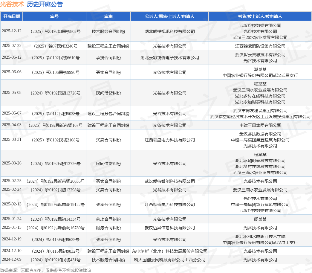 案号:(2025)鄂0192知民初802号根据统计,近一年内以光谷技术有限公司为当事人的历史开庭公告有17则,其中案由为“买卖合同纠纷”的公告以6则居首,其次为“建设工程施工合同纠纷”有3则,“技术服务合同纠纷”有2则。历史开庭公告如下: