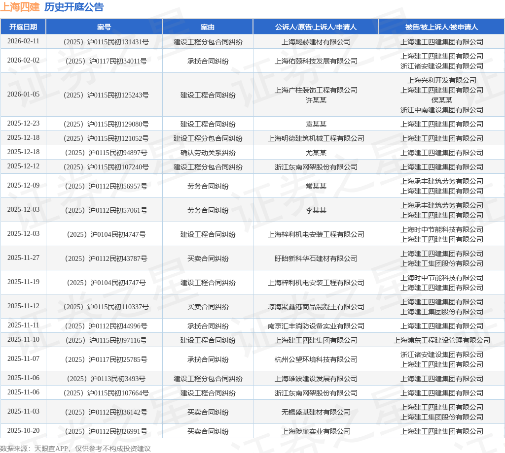 案号:(2025)沪0115民初107240号根据统计,近一年内以上海建工四建集团有限公司为当事人的历史开庭公告有134则,其中案由为“买卖合同纠纷”的公告以29则居首,其次为“建设工程分包合同纠纷”有24则,“建设工程合同纠纷”有13则。历史开庭公告(前20条)如下: