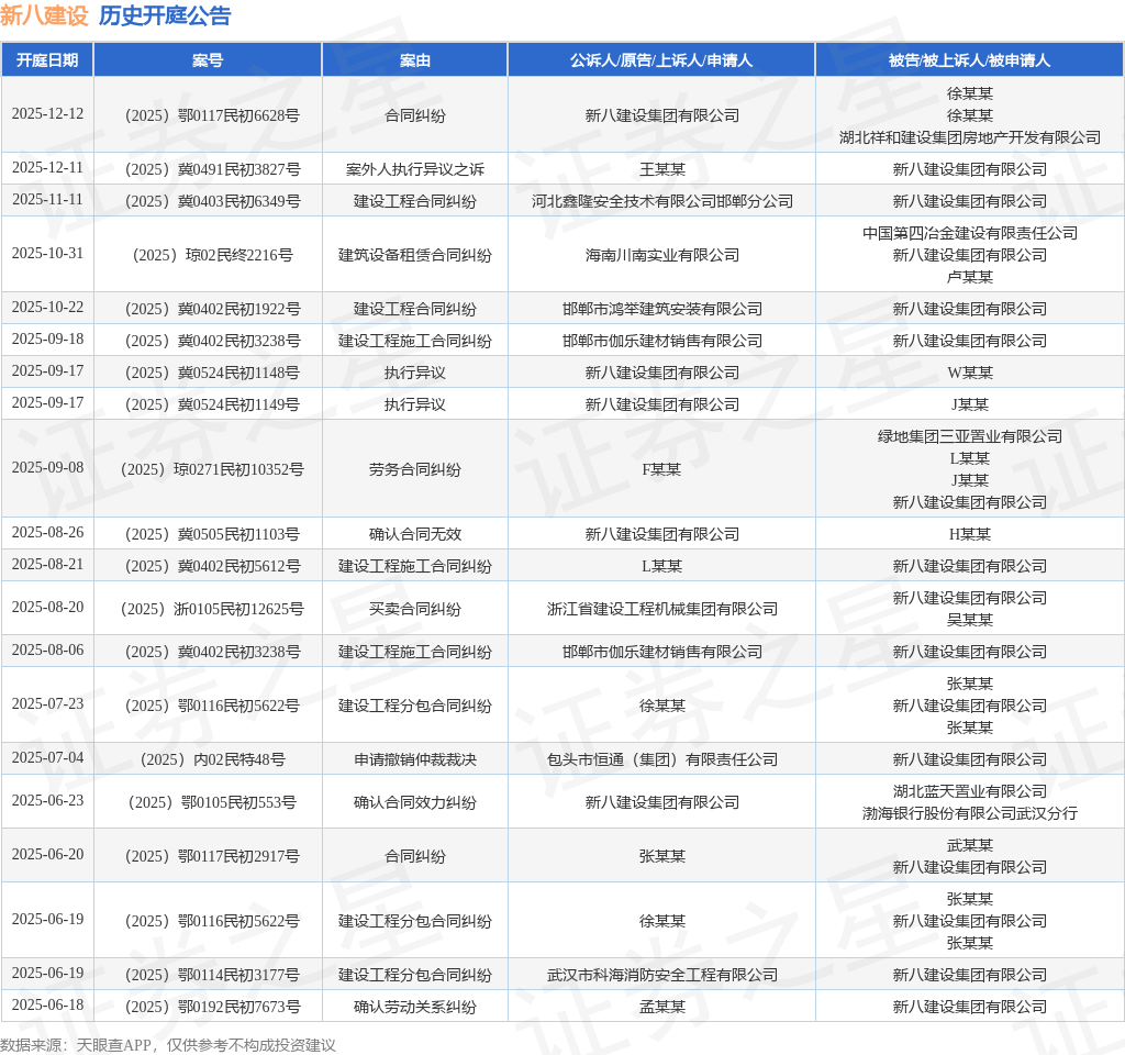 案号:(2025)鄂0117民初6628号根据统计,近一年内以新八建设集团有限公司为当事人的历史开庭公告有97则,其中案由为“买卖合同纠纷”的公告以22则居首,其次为“建设工程施工合同纠纷”有20则,“建设工程分包合同纠纷”有9则。历史开庭公告(前20条)如下:
