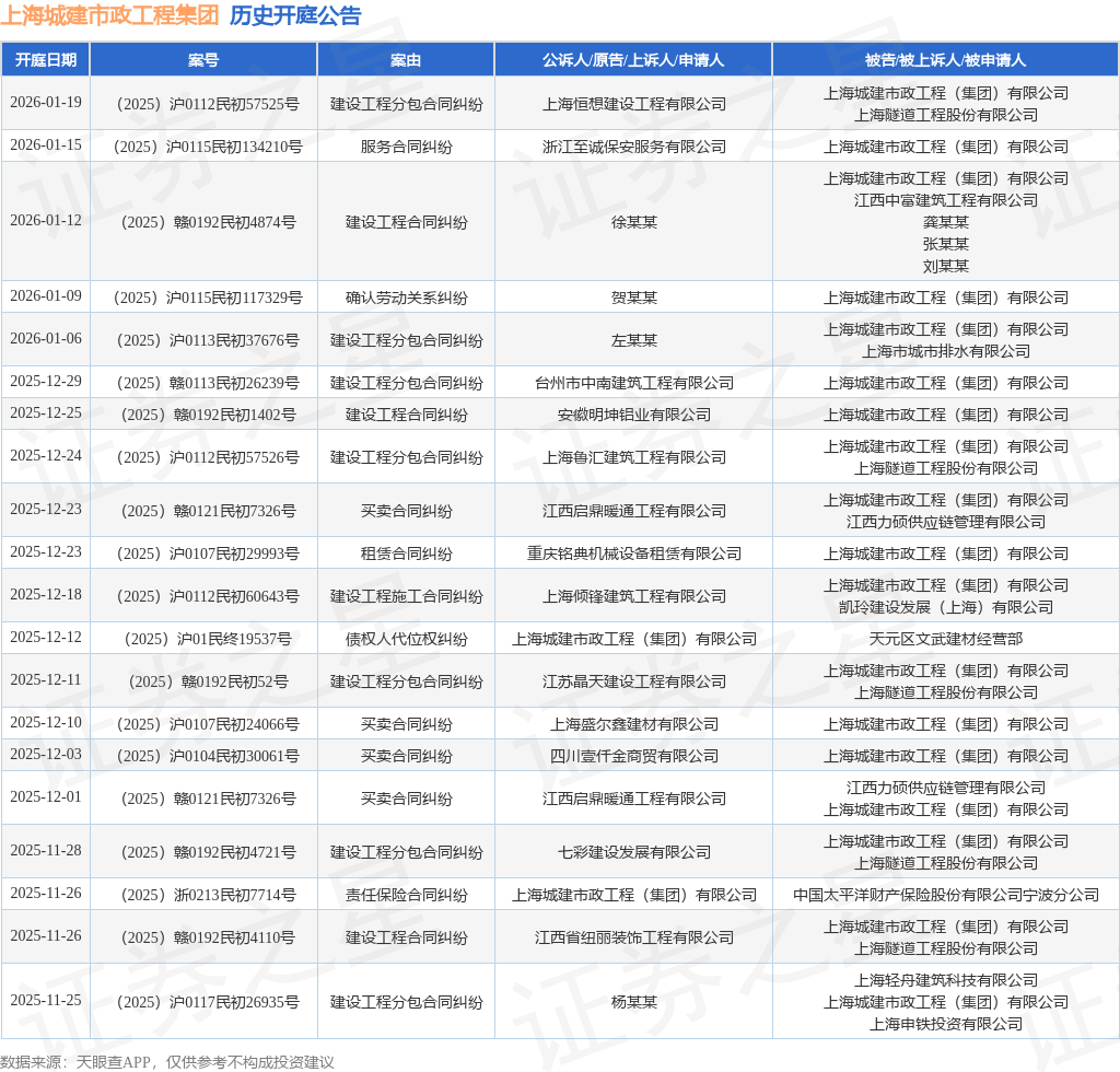 案号:(2025)沪01民终19537号根据统计,近一年内以上海城建市政工程(集团)有限公司为当事人的历史开庭公告有96则,其中案由为“建设工程施工合同纠纷”的公告以20则居首,其次为“建设工程分包合同纠纷”有14则,“买卖合同纠纷”有14则。历史开庭公告(前20条)如下: