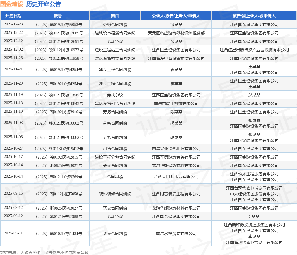 案号:(2025)赣0121民初12691号根据统计,近一年内以江西国金建设集团有限公司为当事人的历史开庭公告有49则,其中案由为“买卖合同纠纷”的公告以10则居首,其次为“建设工程施工合同纠纷”有10则,“劳务合同纠纷”有8则。历史开庭公告(前20条)如下: