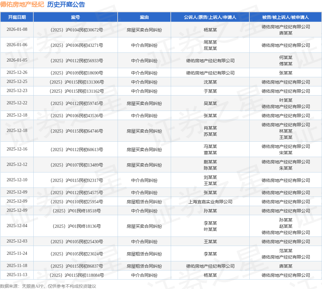 案号:(2025)沪0107民初13489号根据统计,近一年内以德佑房地产经纪有限公司为当事人的历史开庭公告有182则,其中案由为“中介合同纠纷”的公告以93则居首,其次为“房屋买卖合同纠纷”有31则,“房屋租赁合同纠纷”有26则。历史开庭公告(前20条)如下: